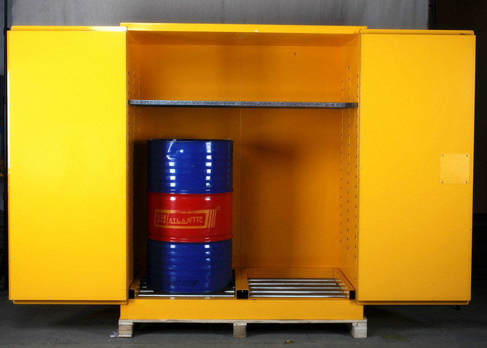 الطريقة الآمنة لجمع وتخزين النفايات الخطرة القابلة للاشتعال هي مع خزائن برميل النفايات الخطرة SSL®. تم تجهيز الخزائن بمرفق لاحتواء حاويات 5 غالونات.